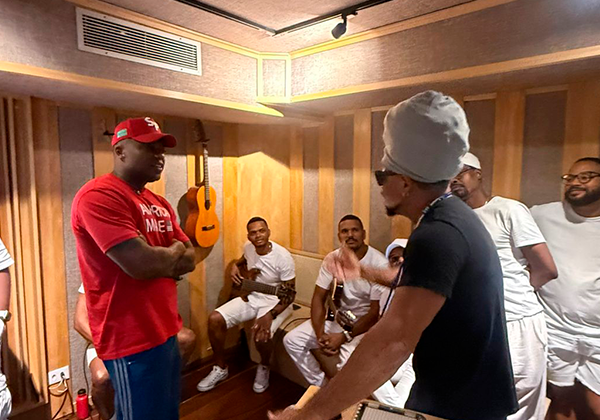 “Brown me ligou, me convidou pra cantar esse samba junto com ele, uma composição que ele fez. Mandou pra mim, a gente dividiu algumas ideias e gravamos aqui no estúdio dele. Ele tem acompanhado o Sambadurras, e quando me viu cantando esse samba, quis registrar. É uma música que fala das coisas que acontecem na Bahia, mas também da coletividade, chamando as pessoas pra participarem desse movimento que é o samba de roda”, conta Escandurras.