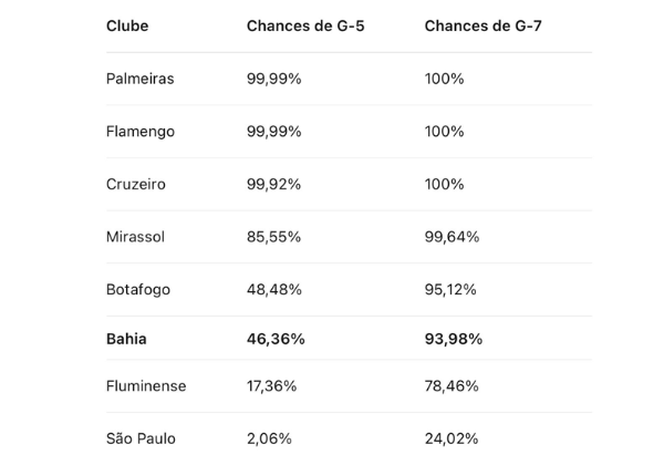 O Bahia segue com boas perspectivas na luta por uma vaga na Conmebol Libertadores de 2026, mesmo após a derrota para o Atlético-MG na última rodada. Segundo projeção do perfil estatístico Gato Mestre, do ge.globo, o Tricolor tem 93,98% de probabilidade de encerrar o Brasileirão dentro do G-7, zona que garante, ao menos, presença na fase preliminar da competição continental.